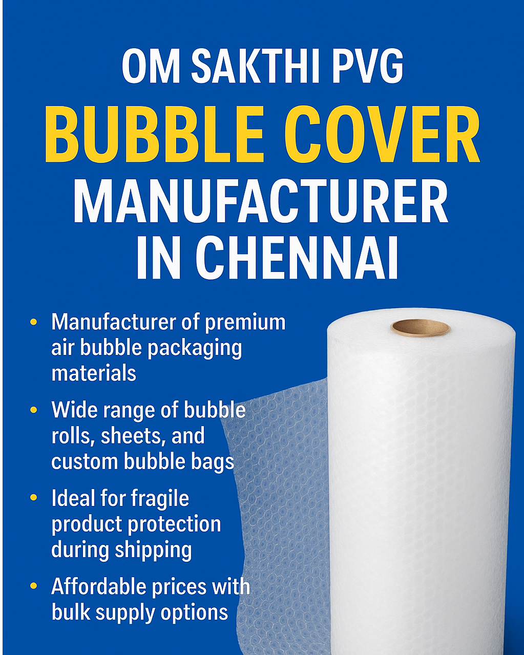 Om Sakthi PVG – Leading Bubble Cover Manufacturer in Chennai Looking for reliable bubble cover manufacturers in Chennai? Om Sakthi PVG Pactech Pvt. Ltd. is one of the most trusted names in the packaging industry, delivering high-quality air bubble covers, rolls, and sheets designed to keep your products safe during storage and transportation. With years of expertise, Om Sakthi PVG specializes in manufacturing durable and shock-resistant bubble covers that provide superior protection against scratches, impacts, and dust. Our bubble wraps and custom bubble bags are widely used across industries such as electronics, glassware, automotive, furniture, and e-commerce packaging. Why Choose Om Sakthi PVG for Bubble Covers in Chennai? Manufacturer of premium air bubble packaging materials Wide range of bubble rolls, sheets, and custom bubble bags Ideal for fragile product protection during shipping Affordable prices with bulk supply options Serving industries across Chennai and Tamil Nadu Products We Offer Air Bubble Covers Bubble Wrap Rolls & Sheets Customized Bubble Bags Laminated & Printed Packaging Solutions Corrugated and Plastic Packaging Boxes At Om Sakthi PVG, Chennai, we focus on delivering eco-friendly, durable, and cost-effective bubble packaging solutions that meet the diverse needs of businesses. Whether you need standard bubble rolls or customized bubble covers, we ensure timely delivery and excellent quality.